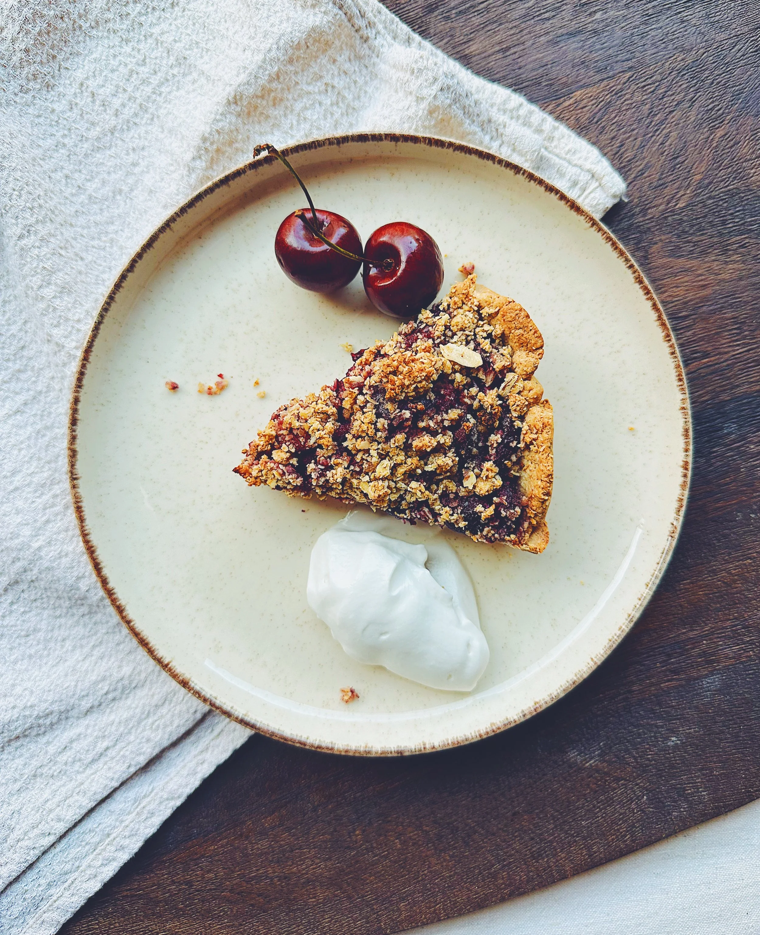 Serve cold or warm a slice up in a hot oven for 5 minutes. Plate with some fresh cherries and a helping of coconut yoghurt.