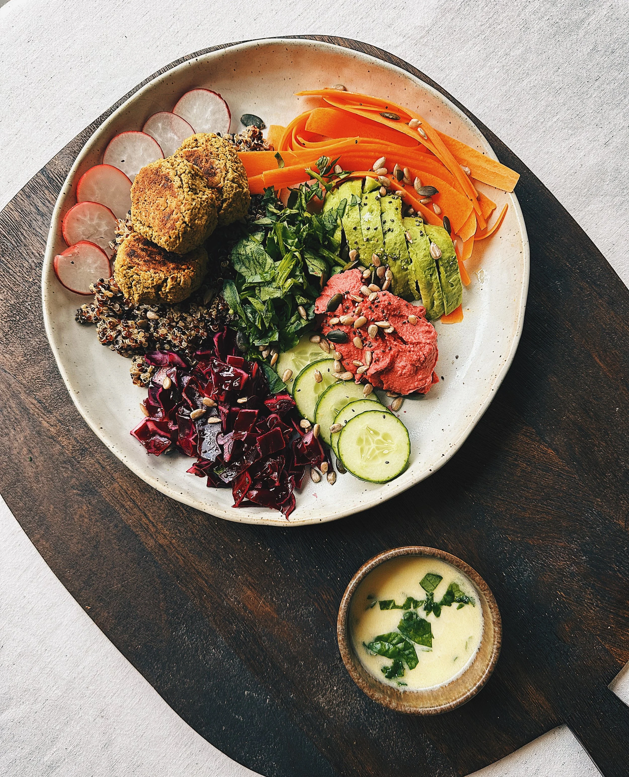 Falafel buddha bowl with lemon olive oil dressing.