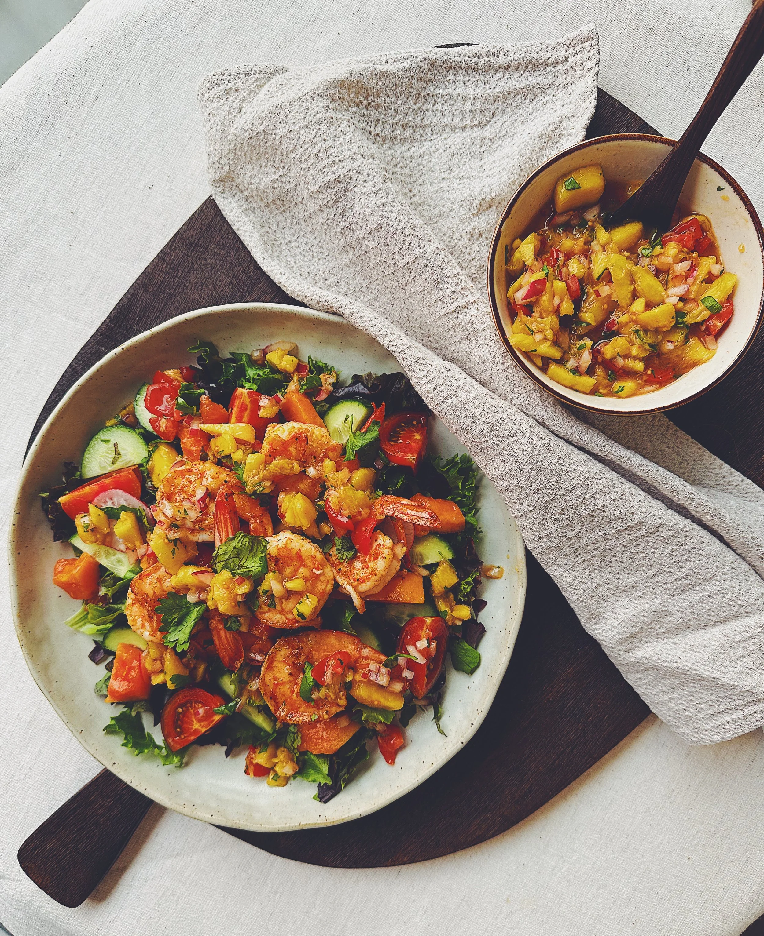 This recipe is packed full of vitamins, minerals and antioxidants but also flavour and colour. Fresh, vibrant, tangy and sweet. This salad will leave you perfectly full, but light and energised. A quick lunch, summer evening dinner or perfect pre-exercise fueler. This one will have you making it over and over again. It also goes great with grilled chicken instead of prawns.